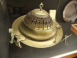 Although the most widespread and traditional brasero was the metal brasero made of different alloys throughout history,[11] there were also several models of ceramic brasero (due to its condition as a pottery object with older precedents ). They used to be open containers, ovoid in shape and with multiple holes. It has often been confused with the portable stove, used to keep the pot of food warm, although this, and especially its embers, could be used as a brasero or to feed it.[12]