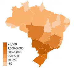 According to 2024 estimates from the Observatory of Migrations in São Paulo (OBMigra), approximately 68,650 Paraguayans reside in Brazil, with their presence being most significant in the states of Paraná, São Paulo, and Mato Grosso do Sul.[7] In some border zones, Brazilians who reside in Paraguay and their descendants are more than 90% of the population and Portuguese is widely spoken.[8] In the town of Mbaracayú, approximately 80% of its 23,000 inhabitants are of Brazilian ancestry. The origins of brasiguaios are said to be mostly from the three states of the South Region of Brazil in proximity to Paraguay, Paraná, Santa Catarina, and Rio Grande do Sul. Most brasiguaios are ethnically White and of German, Italian and Polish descent.[5][9]
