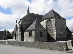 The Brasparts Parish close (Enclos paroissial) is located at Brasparts within Brittany's Châteaulin arrondissement in north-western France. The church is named the Église paroissial Notre-Dame-et-Saint-Tugen. Building started in 1551, a date which appears over the church's west door. The church is often called the "Église de Brasparts"' and is a listed historical monument since 1914.[1] The church is dedicated to the Virgin Mary and Saint Tugen, the Breton saint, and is for the most part built in the Gothic style. It has a double galleried "léonard" style bell-tower with a conical side tower which contains a stairway to access the bells. The porch has statues of the twelve apostles. The north window of the choir dates to 1543. Two niches in the choir area depict the parish's two saints and protectors, the Virgin Mary and Saint Tujan or Tugan.[2][3][4]