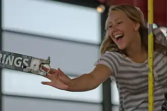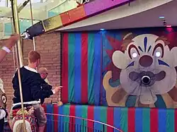 Brass ring devices were prevalent during the heyday of the carousel from the 1870s to the early 1930s, and the first references to brass rings appeared in the 1890s.[3][4][5] They were meant to encourage carousel riders to sit on the outermost row of carousel animals, which were often stationary. While a carousel is in motion, riders on the outermost row can grab rings dispensed from a wooden arm suspended near them. To discourage riders from keeping these rings as souvenirs, images such as clown's mouths and lion's mouths are placed as targets adjacent to the carousel at which the rider's rings can be thrown.[6] Most rings are iron or steel, but one or two per ride are made of brass; if a rider manages to grab a brass ring, it can often be redeemed for a free ride.