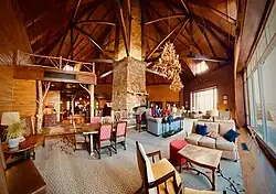 Brasstown Valley Resort is located on the site of a 10,000-year-old Cherokee Native American village. Numerous artifacts were uncovered during excavation and are on display in the resort's basement.[6] The centerpiece of the hexagon-shaped lobby is a 72 foot (22 m) chimney constructed of Tennessee field stone. The lodge's treen theme incorporates crooked sticks and tree trunks throughout. Elk horn chandeliers hang from the ceiling. There are 102 rooms in the four-story main lodge and 32 more rooms in eight cottages around the property. The resort includes a 12,800-square-foot (1,190 m2) conference center, four tennis courts, an indoor-outdoor pool, and a playground. The symbol of the resort is a turtle.[3][5]