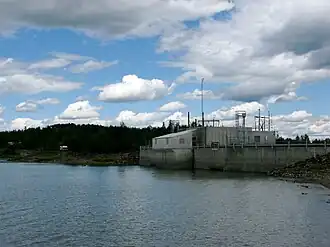 An unusual feature of this hydroelectric development, commissioned in 1965, is a pump system capable of lifting water from the reservoir into the 20-kilometre (12 mi) long canal leading to the power plant so that it can operate at low reservoir water levels.
