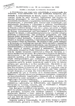 "Therefore, Sir, in our name and in the name of the coalition Provinces, whose cause and sentiment are the same, we intend and request with the greatest instance and with the most just hope to the title that Your Royal Highness has accepted as Constitutional and Perpetual Defender of Brazil, that for my sake of the prosperity of the inhabitants of this Kingdom, of the integrity and greatness of the Luso-Brazilian monarchy, of our constitutionality and V. A. Real, that and it is necessary I design that a General Assembly of the Provinces of Brazil, represented by a competent number of deputies, which cannot be less than one hundred, be convened in this Court."[4]