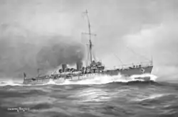 Bahia was part of a large 1904 naval building program by Brazil.[6][7] Also planned as part of this were the two Minas Geraes-class dreadnoughts, ten Pará-class destroyers, three submarines and a submarine tender.[7][8] With a design that borrowed heavily from the British Adventure-class scout cruisers,[1] Bahia's keel was laid on 19 August 1907 in Armstrong Whitworth's Elswick, Newcastle upon Tyne yard.[1][2] Construction took about a year and a half, and she was launched on 20 January 1909 with Madame Altino Correia being the sponsor on behalf of Madame Dr. Araugo Pinho.[9][2][6][A] The process of fitting out pushed its completion date to 2 March 1910,[2] after which it sailed to Brazil and arrived in Recife on 6 May.[3] The new cruiser—the third ship of the Brazilian Navy to honor the state of Bahia[3][6]—was commissioned into the navy shortly thereafter on 21 May 1910.[3] As a class, Bahia and Rio Grande do Sul were the fastest cruisers in the world when they were commissioned,[1] and the first in the Brazilian Navy to utilize steam turbines for propulsion.[3]