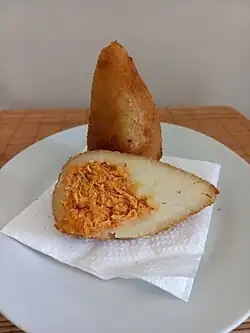 Other appetizers that can typically be found in Brazilian territory are: croquette, rissole, coxa-creme, cueca virada, bolinho de aipim (cassava pastries), among others.[26][27][28]