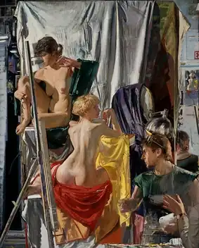 Breaking the Pose – alternately titled Breaking the Pose (The Art Class) [1]: Color Plate 18  – is an oil painting from 1986 by the painter Jerome Witkin. Completed when the artist was 47 and working as a professor at Syracuse University, the work demonstrates why Witkin has been called one of the greatest contemporary artists of his time[2] and one of today's great narrative painters.[3]