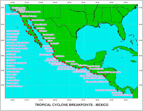 The National Hurricane Center has a list of both formal and informal breakpoints, which it uses throughout its areas of responsibility in the Eastern Pacific, and in the North Atlantic basins. All of these breakpoints are defined as points on the coastline, and are usually significant towns that are a reasonable distance apart, though the exact distance varies. The NHC's list of breakpoints [1] is adhered to for the issuance of hurricane watches and warnings, for sections of coastline, though the forecasts and the informal discussions are not limited to using breakpoints as points of reference.