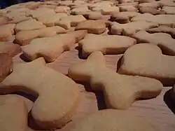 Bredele (also referred to as Bredala, Bredle or Winachtsbredele) are biscuits or small cakes traditionally baked in Alsace and Moselle, France and parts of Southern Germany, especially during the Christmas period.[1] Many varieties can be found, including new ones, so that assortments can be created.[2] They can include anisbredela (cake with egg white and aniseed) butterbredle, schwowebredle (orange and cinnamon), spritzbredle, small pain d'épices and spice cakes that are made with sugar rather than honey.