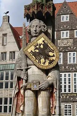 Statues of Roland appear in numerous cities of the former Holy Roman Empire, as emblems of city liberties, Stadtrechte.[1] The Roland statue at Bremen is the oldest surviving example. From Bremen the symbol of civic liberty and freedom spread to other cities and has become a symbol of the new Europe. It has been protected by the Monument Protection Act since 1973.[2] In July 2004, along with the town hall, the statue was added to the list of UNESCO World Heritage Sites in recognition of its outstanding architecture and symbolism of an important historical figure.[3]