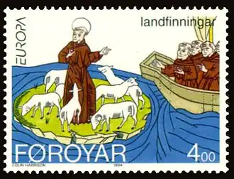 Faroese stamp depicting Saint Brendan, taking up the version that the island he discovered was in the Faroe Islands.