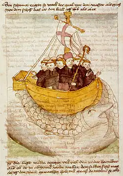 Brendan is primarily renowned for his legendary journey to the Isle of the Blessed as described in the Navigatio Sancti Brendani Abbatis (Voyage of Saint Brendan the Abbot) of the ninth century.[9] Many versions exist that narrate how he set out on the Atlantic Ocean with sixteen monks (although other versions record fourteen monks and three unbelievers who joined in the last minute) to search for the Garden of Eden. One of these companions is said to have been Malo.[10] The voyage is dated to AD 512–530, before his travel to the island of Great Britain. On his trip, Brendan is supposed to have seen Saint Brendan's Island, a blessed island covered with vegetation. He also encountered a sea monster, an adventure he shared with his contemporary Columcille. The most commonly illustrated adventure is his landing on an island which turned out to be a giant sea monster named "Jasconius".