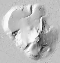 Before the Somerset Levels were drained, Brent Knoll was an island, known as the Isle (or Mount) of Frogs (Mons Ranarum), that provided a safe haven from the water and marshes.[8] According to legend, Ider son of Nuth, who was one of King Arthur's knights, came to the Mount of Frogs on a quest to slay three giants who lived there.[9][10][11] The fort has been claimed as the site of Mons Badonicus.[12]