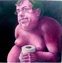 Both paintings[8][9][10] depict Cowen from the waist up, wearing only his glasses. In the RHA painting, he is holding a pair of blue and white underpants in his left hand.[1] In the other, he is clutching a toilet roll.[1][11][12]