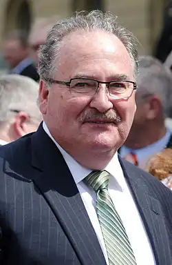 Brian David Mason ECA (born October 12, 1953) is a Canadian politician who was leader of the Alberta New Democratic Party from 2004 to 2014 and served as the Minister of Transportation in Rachel Notley's NDP government.[1] He also served as the Government House Leader. Mason was first elected as a Member of the Legislative Assembly of Alberta for the now-defunct riding of Edmonton Highlands in a 2000 byelection. He was subsequently re-elected, and was elected in Edmonton-Highlands-Norwood after the riding was created in 2004. He chose not to seek re-election in 2019, and was succeeded by Janis Irwin. Mason was the longest serving NDP MLA in Alberta history, with a political career spanning more than 20 years.[2]