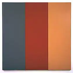 Marden’s early monochromatic paintings exist as single panels, diptychs, and triptychs. In each of the four Red Yellow Blue paintings (1974), the artist painted slabs of dense yet nuanced color on three adjoined canvas panels, using oil paint mixed on the spot with melted beeswax and turpentine and applied with a knife and spatula.[11] He gradually increased the number of panels, arranging them into post-and-lintel configurations.[8]