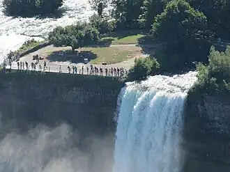 The Cave of the Winds attraction allows visitors to walk up to the base of Bridal Veil Falls. A pedestrian bridge crosses from Goat Island to Luna Island several yards (meters) upstream from the crest of the falls.