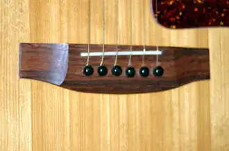 The bridge of the classical guitar does not use bridge pins. In this instrument the strings are tied to the part of the bridge called the tie block. Strings run over the bridge saddle, through drilled holes in the base of the tie block, loop over the top of the tie block, loop under the strings and are tied on. A variation called the 18 hole bridge[1] uses three holes per string and eliminates the need to tie the string down.