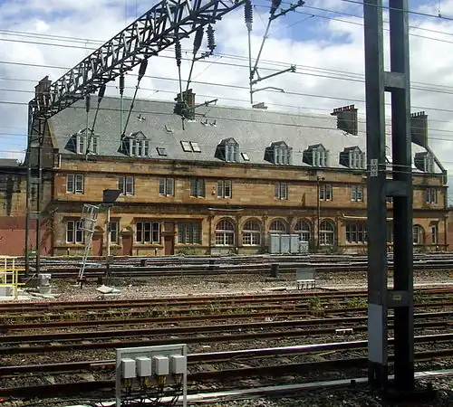 The main block, fronting Bridge Street, was designed by James Miller[9] in early French Renaissance style. The massive four-storey and attic building was built with cream sandstone. There was an arched entrance to a central booking hall at street level and additional entrances leading directly to the platforms at each end of the building, at 40 and 52 Bridge Street. These side entrances are still in use as access to apartments following the redevelopment of the upper levels of the block for residential use in 1994. The station buildings are now protected as a category B listed building.[10]