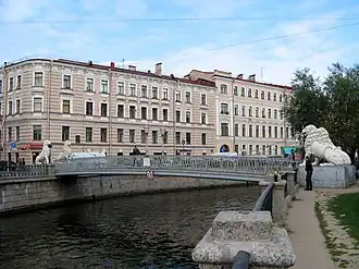 Bridge of Four Lions (Russian: Львиный мост, Мост о четырёх львах) is a 28-metre-long pedestrian bridge over the Griboedov Canal in St Petersburg, connecting L'vinyi Drive to Malaya Podyacheskaya Street. The Lion Bridge is in the Admiralteysky District of St. Petersburg, connecting the Kazansky and Spassky Islands. Its abutments are crowned with four cast iron sculptures of lions, which give the bridge its name. The structure, suspended by cables emerging from the mouths of lions, was constructed in 1825 according to the design of two well-established bridge builders, Wilhelm von Traitteur and Basil Christianovicz. It is an outstanding monument of bridge-building architecture of the first quarter of the 19th century [5]. It is also one of the three surviving pedestrian chain bridges in St. Petersburg (along with Bank and Pochtamtsky bridges).