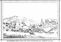 One of the first settlers was Salmon Brown, a Merino sheep farmer, son of John Brown the abolitionist. To rescue his mother Mary from hostility to Brown in Red Bluff, in 1870 he sold his ranch near Corning, California, and bought one near Bridgeville. Mary and her daughters moved nearby, to Rohnerville.[3] In 1893 he moved to Portland, Oregon.[4]