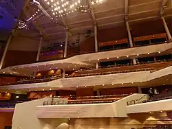 Construction of the hall was a joint venture between Manchester City Council and the Central Manchester Development Corporation who obtained funding from the European Regional Development Fund.[5] The architects were RHWL and the builders were John Laing.[9] The acoustics were designed by Rob Harris of Arup Acoustics; his colleagues at Arup were the building engineers.[7] The Bridgewater Hall can seat 2,341 people over four tiers in the auditorium: the stalls, choir circle, circle, and gallery.[10]