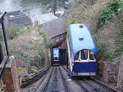 The Bridgnorth Cliff Railway, also known as the Bridgnorth Funicular Railway or Castle Hill Railway, is a funicular railway in the town of Bridgnorth in the English county of Shropshire. The line links the Low Town of Bridgnorth, adjacent to the River Severn, with the High Town, adjacent to the ruins of Bridgnorth Castle. The line is one of four funicular railways in the UK built to the same basic design (the others were the Clifton Rocks Railway in Bristol; the Lynton and Lynmouth Cliff Railway in Devon; and the Constitution Hill Railway in Aberystwyth, Wales). With a maximum gradient of 64% it is one of the steepest railways in the country.