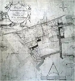 Bridgwater Castle was a substantial structure built in Old Red Sandstone from Wembdon with other stone being transported from Downend in the Polden Hills and Ham Hill by boat.[7] The site covered 8 or 9 acres (32,000 to 36,000 m2). A tidal moat, up to 65 feet (20 m) wide in places,[8] flowed about along the current streets of Fore Street and Castle Moat, and between Northgate and Chandos Street. The moat was filled from Durleigh brook, a tributary of the River Parrett.[9] There is some evidence that there was a weir between the moat and the river.[10] Unusually, the main entrance opposite the Cornhill was built with a pair of adjacent gates and drawbridges. In addition to a keep, located at the south-east corner of what is now King Square,[10] documents show that the complex included a dungeon, chapel, stables and a bell tower. Built on the only raised ground in the town, the castle controlled the crossing of the town bridge. There is documentary evidence describing the castle as having "outer and inner bailies and that the buildings included the constable's house (on the high ground of King Square), a chapel (St Marks), hall (Mortemere's Hall) and chamber, stables, kitchens, horse mill and gatehouse as well as a bell tower and dovecote.[4]