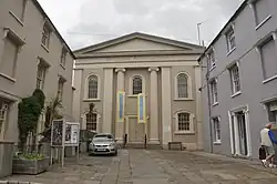 The Methodist chapel was designed by the architect James Wilson of Bath. It was built in 1838, and opened on 28 November of that year. The front elevation, having four giant Doric pilasters with entablature and pediment, originally had "Wesleyan Methodist Chapel" written on its frieze. It is a Grade II listed building.[1]
