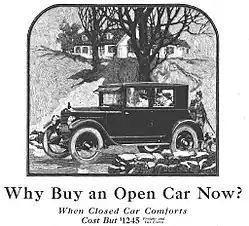 In 1922 Briggs made for Essex a closed car at a price near an open touring car and by 1925 Essex offered buyers the option of an open or closed Briggs bodied car at the same price. As demand for the closed cars expanded more businesses were acquired including competitors supplying to Ford.[1]