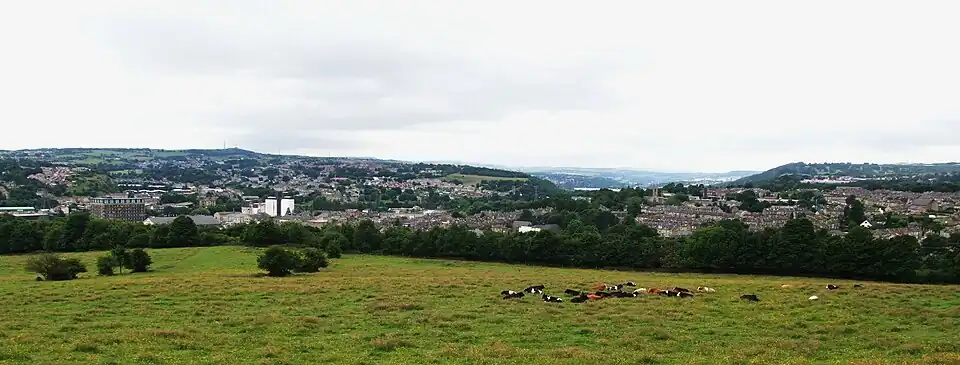 Brighouse (/ˈbrɪɡhaʊs/,[2][3][4][5] locally also /ˈbrɪɡaʊs/[6]) is a town within the metropolitan borough of Calderdale, in West Yorkshire, England. Historically within the West Riding of Yorkshire, it is situated on the River Calder,[7] 4 miles (6.4 km) east of Halifax. It is served by Junction 25 of the M62 motorway and Brighouse railway station on the Caldervale Line and Huddersfield Line. In the town centre is a mooring basin on the Calder and Hebble Navigation. The United Kingdom Census 2001 gave the Brighouse / Rastrick subdivision of the West Yorkshire Urban Area a population of 32,360.[8] The Brighouse ward of Calderdale Council had a population of 11,195 at the 2011 Census.[9] Brighouse has an HD6 postcode, despite being associated with Halifax for local government.