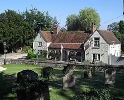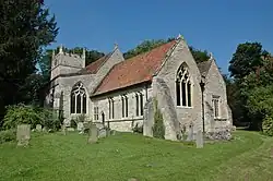The earliest parts of the Church of England parish church of Saint Bartholomew are 13th century, including a stair turret and a number of lancet windows, notably in the chancel.[8][9] Early in the 14th century the nave was rebuilt in the Decorated Gothic style, with north and south aisles linked to it by arcades of four bays.[8] The west tower and the Perpendicular Gothic east window of the chancel were added in the 15th century.[8] The pulpit and tester are Jacobean[8] and therefore 17th century. The building was restored in 1895 and is a Grade I listed.[9] Church monuments in St Bartholomew's include a number of brasses.