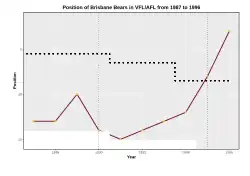 The club came close to folding prior to its move to Brisbane and the AFL began preparing a contingency for its demise in the event that the move was to fail. While the Bears improved on the field, the club continued to struggle financially. At the end of the 1996 season, the AFL helped negotiate a deal with the Fitzroy Football Club administrator whereby the Bears took over Fitzroy's AFL assets and operations and as a condition of that deal, on November 1, 1996, Brisbane Bears members voted to change the club's name to the Brisbane Bears-Fitzroy Football Club (BBFFC or Brisbane Lions), who participate in the AFL today.[3][4] The Bears played in 220 VFL/AFL matches over ten seasons, with 70 wins, 148 losses and 2 draws.[5]