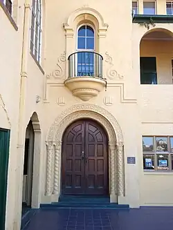 Decorative features to both frontages include gargoyles, twisted columns between arched windows and to principal doorways, and arched cornices to gables, the tower and the campanile. A three-storeyed annex extends to the north-east, sitting a half a storey below the rest of the building; it has a hipped roof, rectangular windows, tiled awnings to the south and a timber porch to the north.[1]