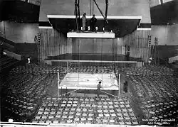 The Festival Hall was originally known as Brisbane Stadium, which was built in 1910.[1] In addition to its primary use as a venue to watch boxing, the Brisbane Stadium was also a venue for live concerts. Louis Armstrong, Nat King Cole and Johnnie Ray played there in the 1950s.[2] In 1958, the venue was demolished and a new building constructed, by then leading Queensland Construction Company E.J.Taylor & Sons, as part of the Centenary of Queensland. It was opened on 27 April 1959 and renamed Festival Hall. With a capacity of 4,000 people, it was the largest indoor public venue in the Brisbane inner city area and it remained the city's primary indoor venue for more than forty years. It was designed in a postwar modern style, similar to its namesake, the Royal Festival Hall in London.[1]