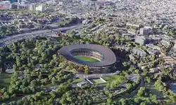 On 25 March 2025, Premier Crisafulli announced that as a result of the review, a new 63,000-seat stadium would be constructed at Victoria Park to host the ceremonies and athletics. After the conclusion of the Games, the Gabba will be demolished and its site will be redeveloped as a residential neighbourhood; the Olympic stadium will succeed it as Brisbane's main football and cricket stadium.[44][45] According to the review, the stadium will cost an estimated $3.785 billion, although this figure is yet to be publicly confirmed.[46][47] Designer Michael Rayner stated that the chosen outcome was similar to a proposal that he mentioned during a lecture in 2019. Rayner noted that a cluster of major venues, which would be "as great a hallmark of Brisbane as Melbourne Park is to Melbourne." Rayner in his proposal thought that the land required for the stadium, Brisbane Live and the pool in the park would less than a third of Victoria Park, leaving some 30 hectares or so for the public, about twice the area of Sydney’s Hyde Park. But since Brisbane Live will be constructed somewhere else Rayner thought that the stadium and pool would only take up around 20% of the 64-hectare park.[48][49] The 100-day review noted that 68% (47.02 hectares) of the total area of the park would be retained as green space, with the stadium itself taking up less than 10% of the area.[3]