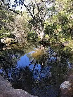 Brisbane Water National Park is under the jurisdiction of the NSW National Parks & Wildlife Service (NPWS), under the Office of Environment & Heritage. Park management is vital in conserving biodiversity by offering physical protection to vulnerable and endangered wildlife. This refuge for Australian native plants, animals, and ecosystems allows research programs and conservation initiatives to be undertaken such as weeding and pest control programs to restore native habitats. Fire management strategies are developed in the balance of protecting life, Aboriginal sites, historical sites, and natural processes.[28] The areas surrounding the national park on plateaus was easily settled, therefore the remaining area originally reserved for parkland was limited to remnant areas on the plateau and areas of the catchments in Mooney Mooney, Patonga, and Mullet Creeks, because these areas remained inaccessible for settlement, they are generally harder for access. The locations of settlements mean the national park is hemmed in on two sides by development. The threats to the park caused by intensive agricultural, urban, and industrial development on the boundaries and headwaters make the management of the park difficult, and are increasing over time with continual development proposals such as those on the Kariong and Somersby plateaus which are in various catchment areas of the park.[6] The following are some of the other management issues in the park. Woy Woy refuse tip is an inholding within the park which is a particular management issue as it is within the Patonga Creek Catchment. Agricultural, industrial, and domestic runoff from surrounding developments have long term harmful impacts on aquatic plant communities. Weeds also spread down creek lines from runoff. Fire suppression and management trails need to be planned so potential impacts and erosion which leads to sedimentation of creeks is minimised. Dirt bikes and four wheel drive access to the park is not permitted. Physical damage to plants and soils occurs and erosion has further impacts. Their access is hard to manage as many possible entry points are available.[6]