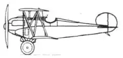 The Scout F[2] was a single-bay biplane with staggered unequal-span wings with straight edges and rounded tips. Ailerons were carried only on the upper planes and there were smooth cutouts in both to improve the view from the open cockpit, placed just behind the trailing edge. The tail was conventional, with unbalanced control surfaces. The Scout F had a fuselage-mounted single-axle main undercarriage forward of the lower wing, plus a tailskid. The water-cooled V-8 Arab engine allowed a smooth and quite short installation, ending in a two-blade propeller and conical spinner. There was a small bulge on top of the cowling for the coolant header tank and the radiator was placed in a tunnel fairing between the undercarriage legs, with a pair of shutters for coolant temperature control.[2]
