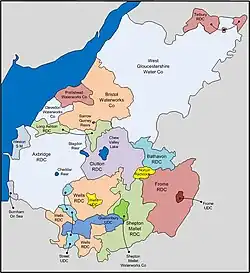 Actual amalgamations took place on 1 January 1959 with Shepton Mallet Waterworks Company, who had just celebrated their centenary on 12 December 1958, with Glastonbury Corporation on 1 April 1959, with West Gloucestershire Water Company on 1 July 1959 and with Wells RDC on 1 October 1959. This resulted in the company supply a population of 680,000, spread over an area of 647 square miles (1,680 km2).[24] The water supply undertakings run by Clutton RDC and Shepton Mallet RDC were taken over on 1 April 1960, with Weston-super-Mare following on 1 October 1960.[25] The population supplied increased to 802,000 over an area of 815 square miles (2,110 km2) with the takeover of Tetbury RDC and Wells City waterworks on 1 April 1961.[26] Further expansion took place on 1 April 1962, when Frome RDC was taken over, and the undertakings of Frome UDC, Street UDC and Burnham-on-Sea UDC following on 1 October.[27] Bathavon Rural District was taken over on 1 April 1963,[28] and the final major takeover was of Norton Radstock UDC on 1 April 1964, increasing the area of supply to 934 square miles (2,420 km2), subsequently reduced to 923 square miles (2,390 km2) as a result of some minor changes.[29]