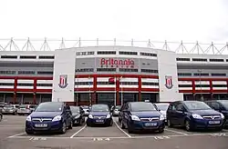The stadium was built in 1997 at a cost of £14.8 million as a replacement for the Victoria Ground. Former player Sir Stanley Matthews' ashes were buried beneath the centre circle of the pitch following his death in February 2000; he had officially opened the stadium on 30 August 1997.[7] In European competitions it is known as the Stoke City Stadium due to UEFA regulations on sponsorships.[8][9][10]