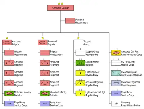 Between May 1939 and May 1945, there were nine changes in the organisation of the divisions.[25] When first formed, the Mobile Division had six light tank regiments in two cavalry brigades and a tank brigade of three medium regiments. The division was supported by a Pivot Group of two motorised infantry battalions and two artillery regiments.[5] Mobile Division (Egypt) consisted of a light armoured brigade, a cavalry brigade, a heavy armoured group of two Royal Tank Regiments and a Pivot Group.[8] On 25 May 1939, the Army decided that the organisation should change to an armoured division of a light and a heavy armoured brigade, each of three armoured regiments, totalling 349 tanks; 159 light cruisers, 108 light tanks, 58 heavy cruisers and 24 close support tanks. The two armoured brigades would have a Support Group that contained the divisional field artillery regiment, a mixed light anti-aircraft–anti-tank regiment, two motorised infantry battalions and the division's engineers.[26] The support group provided whatever support the armoured brigades needed, being able to provide motorised infantry, field artillery, anti-tank artillery or light anti-aircraft artillery as needed.