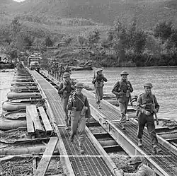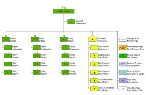 The Infantry brigade typically had a HQ company and three infantry battalions. Fire support was provided by the allocation of an MMG company, anti tank battery, Royal Engineer company and/or field artillery regiment as required.[24] Brigade Groups, which operated independently, had Royal Engineer, Royal Army Service Corps, Royal Army Medical Corps and Royal Electrical and Mechanical Engineers units permanently assigned. Brigade groups were also formed on an ad-hoc basis and were given whatever resources was needed to complete an objective. However, it was intended before the war that the division was the lowest formation at which support (particularly artillery fire) could be properly concentrated and coordinated. Lieutenant-General Montgomery reimposed and reinforced this principle when he assumed command of the Eighth Army in North Africa in 1942, halting a tendency to split divisions into uncoordinated brigades and "penny packets".[25]