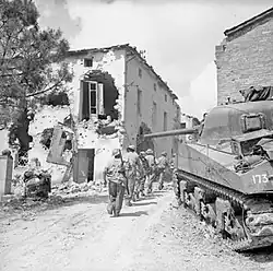 In 1944, the division's armoured regiments comprised 78 tanks.[34] The regimental headquarters was equipped with four medium tanks, an anti–aircraft troop with eight Crusader Anti–Aircraft tanks, and the regiment's reconnaissance troop with eleven Stuart tanks.[40][a] Each regiment also had three Sabre squadrons; generally comprising four troops each of four tanks, and a squadron headquarters of three tanks. The Sabre Squadrons contained three close support tanks, 12 medium tanks, and four Sherman Fireflys.[b] Additionally, 18 tanks were allocated to the armoured brigade's headquarters and a further ten to the division's headquarters.[34]