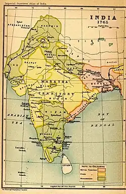 The East India Company fought three Anglo-Maratha Wars with the Maratha Confederacy. The First Anglo-Maratha War ended in 1782 with a restoration of the pre-war status quo.[93] The Second and Third Anglo-Maratha wars resulted in British victories.[94] After the surrender of Peshwa Bajirao II in 1818, the East India Company acquired control of a large majority of the Indian subcontinent.[95]