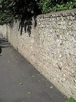 Tall flint and brick walls, dating from 1866, surround the complex on all sides. Small flints laid in courses form the main building material on three sides. Other parts have red brickwork with inset flints, and the main entrance has red-brick piers with knapped flintwork. There are also iron railings and gates with the fleur-de-lis emblem. The walls have recesses on the inside and outside at irregular intervals; one on the outside of the south wall contains a drinking fountain with a panel imploring users to commit no nuisance.[1][33] Flints are prevalent in this downland area; so many were found when the pumping station was built that the contractors fashioned them into a deliberately ancient-looking folly on the southwest corner of the engine rooms.[13]