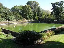 Standing in the grounds behind the complex, the cooling pond measures 1,100 square feet (100 m2) and has a leat around three sides; it opens out on the southwest side. It is surrounded by small walls of red brick and terracotta. Pipework connects the leat to the boiler house, from which hot water flows; heat exchange takes place in the cooling pond; and cold water is returned to be used in the boilers.[32]