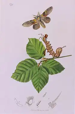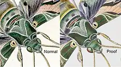 It was a masterpiece of the engraver's and colourist's art, described by Pierre André Latreille (1762–1833) (but wrongly attributed to the eminent French naturalist Georges Cuvier) as the "paragon of perfection". Close examination of a proof set of plates (see below) reveals an obsessive attention to detail. The shading of the foliage is typically achieved by multiple, finely engraved lines spaced at intervals of five or more to the millimetre. The fronds (olfactory receptors) of many moth antennae are individually coloured – as in plate 674 (left). Several beetles and flies have body and limb highlights picked out in minute dots and lines of powdered gold. Thoracic and abdominal hairs are mostly painted individually. Where transparent wings are shown extended the colouring involved the precise application of multiple colour washes overlaid by a satin finish, gum arabic glaze to reproduce the visual effect of iridescence.