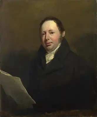 Other founding Governors included George Legge, 3rd Earl of Dartmouth as President, the Marquess of Stafford, Sir Francis Baring, 1st Baronet, William Holwell Carr, John Julius Angerstein, Sir Abraham Hume, 2nd Baronet, Sir Thomas Bernard, 3rd Baronet, and others. They were essentially the same group who were to succeed in persuading the government to found the National Gallery in 1824, and whose gifts to it provided most of the early collection. There was a total group of 125 Governors, Directors and Subscribers, paying sums between 100 guineas (56 of them, 35 at 50g., 11 at 10g.) down to one guinea annually. In 1805 the initial subscribers consisted of "One duke, five marquesses, fourteen earls, two viscounts, nine lords, two bishops, four ladies, seven baronets, twenty-two members of parliament, five clergymen and above fifty private gentlemen, bankers and merchants".[5] The Institution had been discussed with the Royal Academy before it was established, and relations were friendly, at least initially, though later there were to be tensions. The Prince Regent was Patron from the foundation, and loans from the Royal Collection continued throughout the life of the Institution. In 1822 the hereditary nature of the Governors was eased out, as they were becoming far too numerous, and the bottom end of the Subscribership tightened up.[6][7]