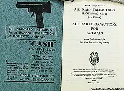 During World War I, abandoned feral pets in London had become a major issue.[5] In 1939, the British government, seeking to avoid a repeat of this, formed the National Air Raid Precautions Animals Committee (NARPAC) to decide what to do with pets before the war broke out.[5] The committee was worried that when people evacuated, they might leave their pets behind. In response to that fear, NARPAC published a pamphlet titled "Advice to Animal Owners." NARPAC's messaging was primarily focused on evacuation, suggesting moving pets from the big cities and into the countryside; but a line at the end noted that "if you cannot place them in the care of neighbours, it really is kindest to have them destroyed."[6][5]