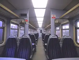 The fleet was part of the "Super Sprinter" build, the other part of which was the Class 156 fleet - though only the latter carried the "Super Sprinter" branding. They were manufactured by British Leyland, who used similar construction techniques to those used on the more basic Pacer railbuses. The relatively lightweight body, which was mounted on a welded floor assembly, comprised a series of pre-formed panels that were fixed together via the extensive use of Avdel rivets. The body is lined with a somewhat large number of windows, which is said to make the coaches appear unusually long; despite considerations towards adopting sealed windows to reduce noise levels, the windows are openable for natural ventilation.[9] It has been observed that, as a byproduct of the vehicle's lightweight construction and length, certain coaches have exhibited a slight, but visible, sag.