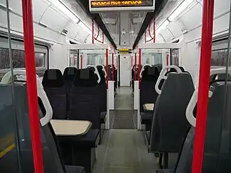 Two prototype units that were operated by Vivarail, designated as 230001 and 230002.[18] The diesel-electric multiple unit (DEMU) 230001 is a three-car unit; each of these is outfitted with passenger fitting and fixtures, including seats, tables, a single toilet, onboard Wi-Fi, and electrical charging points. 230001 retains the original Brush traction motors, but future units make use of AC motors from Traktionssysteme Austria.